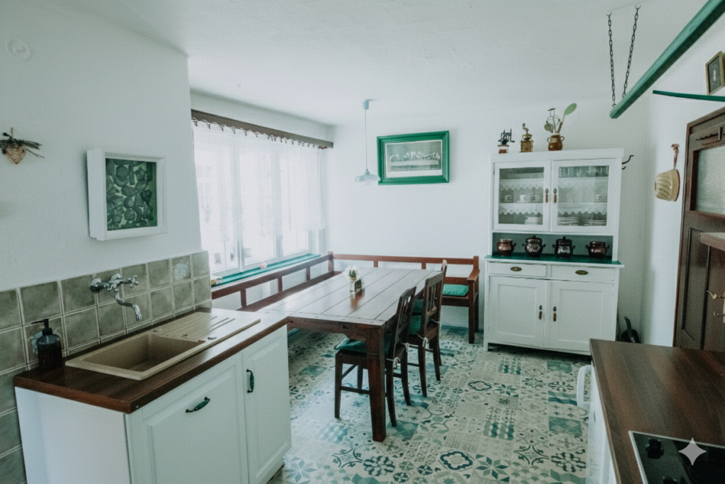- Plně vybavená kuchyň s lednicí, mikrovlnou troubou, sklokeramickou deskou, toustovač, rychlovarná konvice, domácí pekárna atd.